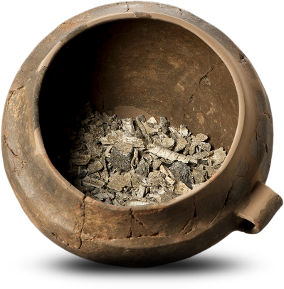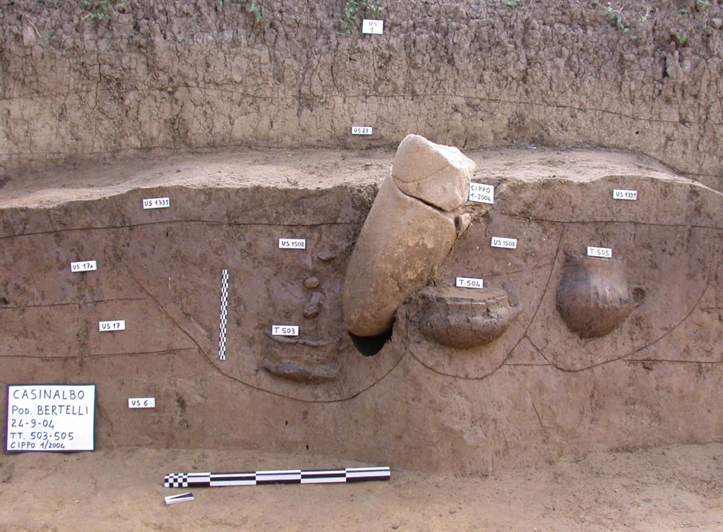 Le ossa combuste dei defunti erano custodite in urne cinerarie deposte all’interno di pozzetti e spesso segnalate da grandi ciottoli fluviali.